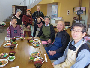 四月二〇日、月に一回のサロン「ひなたの会」を開きました。手づくりの食事は春らしくタケノコや山椒の入ったばら寿司、すまし汁、フルーツでした。みんなでわいわい言いながらおいしくいただきました。