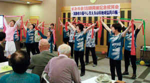 五月一五日、すみれ会は一〇〇回目を迎えました。当日はマンドリン・ギターの演奏を聞き、ストレッチサークルの皆さんのボールとリボンを使ったストレッチ体操の発表(写真)もありました。