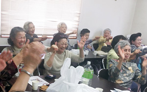 支部委員の浅野さんの名司会ぶりで、終始和やかにすすんでいきました。歌や脳トレもして、お腹を抱えて笑い合う楽しい会にすることができました。