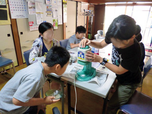 午前中は持ち寄った夏休みの宿題を進めます。講師は米の山病院の田淵大樹医師や研修医の副島忠弘医師、事務職員、医学生、友の会の支部長や班長が務めます。受験生の中学3年生は必死でわからないところを教えてもらっていました。
