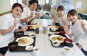 城北病院リハビリテーション部では、4年目職員の辻村さん、奥さん、稲元さん、松村さんの仲良し4人組がグループチャレンジに挑戦。「4人でできる健康的で楽しいことは…」と考えて、週に1回「わたや」でご飯を食べることに。