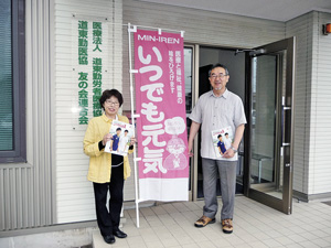 かなり大変な目標ではありますが、どこまで目標に近づけるかみんなで楽しみながら取り組んでいます。拡大のために取り寄せた「タミさんのぼり」は、連合会の事務所の前に掲げました(写真)。共同組織活動交流集会に参加する方たちが率先して取り組み、さっそく2部購読につながりました。