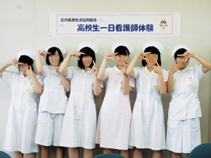 まず看護師の仕事内容を写真を見せながら紹介し、鶴岡協立病院の各部門を見学して回りました。看護師とともに病棟にも入ります。高校生の訪問は患者さんから大変喜ばれています。