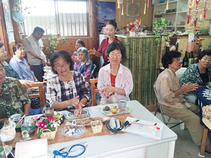 奄美大島の大和村では10の支え合いグループが各集落で活動しています。その中の1つ、名音集落では「のんティダの会」が毎週土曜日に、改装した物置小屋で笑談所(喫茶コーナー)を開いています。「のん」は名音のこと、「ティダ」は奄美の方言で「太陽」の意味です。当生協では、のんティダの会を班として登録しています。
