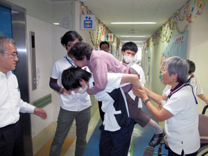 エレベーターが復旧しない中、4階の小規模多機能ホーム、5階のデイサービスの利用者計42人に、階段を使って1階に避難していただくことに。全職員が協力して歩ける利用者さんの転倒を注意しつつ、歩けない方はおんぶしたり、車いすを抱えて移動。大きな混乱もなく、全員が1階にたどり着きました。