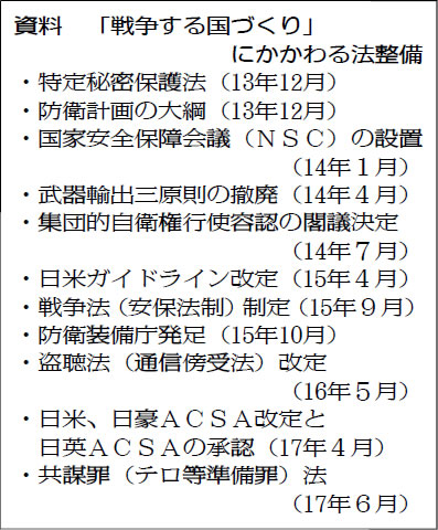 安倍首相は、「憲法9条の1項、2項には手をつけず、自衛隊を明記する条文を追加し、2020年を新しい憲法の施行の年としたい」と述べました。憲法「改正」でなく、「新憲法の施行」、すなわち70年続いた日本の平和主義をやめるという「本音」を吐露したのです。衆参両院に改憲を志向する議員が3分の2を占めるいま、加憲による9条破壊を決断、秋にも自民党案を確定し、年内に憲法審査会で審議を開始、2018年中に改憲発議、国民投票の実施を狙っています。この発言は、2012年12月の安倍政権発足以来行ってきた立憲主義破壊の政治の上に、仕上げとして本気で九条改憲を強行し、海外で戦争する国づくりをめざすものです(資料)。