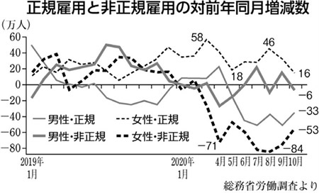 昨年11月の国内の失業者数は195万人と前年同月の比較で44万人増加、10カ月連続の増加です。7月から9月の期間では年収100万円未満の就業者が109万人減少、非正規雇用も125万人減少しました。一方で正社員は45万人増加しており、コロナ禍で失業の増大と格差のいっそうの拡大がすすんでいます。