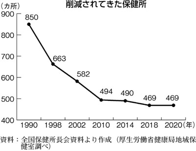 新自由主義のもと、医療崩壊に追い込んできた社会保障の自然増削減の方針は21年度も継続し、公立・公的病院再編・統合の推進、保健所の保健師増員は保健所職員のわずか3%にとどまり、半減させた保健所の数を元に戻す方向性はありません。