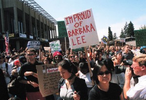 昨年一〇月、アメリカによる空爆が開始したその日、カリフォルニア州サンフランシスコでは、「空爆の即時停止を求める緊急集会」に数千人が結集した。サ ンフランシスコの繁華街はまたたく間に大デモ会場となった。この日の朝よびかけた集会なのに、用意したプラカードや署名用紙が足りなくなるほどで、主催者 側もうれしい悲鳴をあげていた。