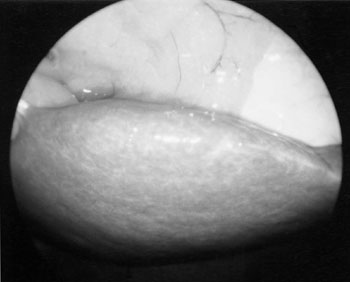 C型慢性肝炎の腹腔写真。肝臓の表面凹凸は軽度で赤みもなく落ちついた肝炎。