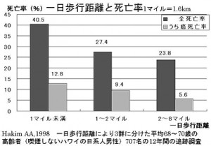 「歩く」という軽い運動でも長寿と関係ある、という研究もあります(図2)。平均年齢68~70 歳の707人を、1日の歩行距離で「1マイル(1・6km)未満」「1~2マイル」「2マイル以上」の3グループに分け、12年間追跡調査した結果、1日 2マイル以上歩くグループの死亡率は、1マイル未満のグループのほぼ半分でした。しかもよく歩くグループは、がんによる死亡が少ないのです。