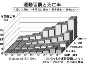 60歳以上では「まったく運動しない」グループの死亡率が、運動グループよりかなり高く、「若干運動する」グループの約2倍からそれ以上でした。「運動の程度が強いほど死亡率が低くなる」という結果がはっきり出ました。