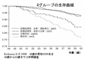 別に、48歳の男性6596人を60歳まで12年間追跡調査した研究があります。糖尿病の人の死亡率は、糖尿病でない人の3倍、通常の治療をした耐糖能 障害の人は2倍でした。しかし食事・運動療法を行なうと、耐糖能障害の人の死亡率を糖尿病でない人と同じレベルに低下できることがわかりました(図4)。