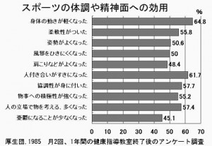 第一次産業は機械化、家事労働は省力化、交通機関は便利になり、糖尿病、肥満、高血圧、高脂血症、動脈硬化症、心筋梗塞など運動不足病が増えました。子 どもたちの体力は年々低下しています。外で体を使って遊ぶ機会が減り、テレビゲームに夢中になる機会が増えたためです。