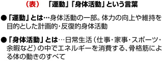 なお、「身体活動」「運動」という言葉は、おおよそ(表)のように考えてください。