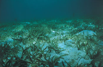 水深二~三メートルのリーフ(サンゴ礁の浅瀬)のサンゴは一時、白化現象で死んでしまった。一説には、エルニーニョ現象による海水温の異常上昇が原因で はないかという。しかし、最近ようやく、少しずつ再生してきている。そのサンゴの間を赤や黄色、青などの色鮮やかな熱帯魚が泳ぎ回っている。砂地の海底は 薄緑色の藻がびっしり生えている。
