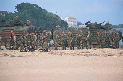 指さした陸の方を見ると、浜辺では、水陸両用戦闘兵員輸送車が水しぶきをあげながら上陸演習をくり返していた。