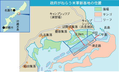 七月二九日、発表された「新基地基本計画」は、東京ドーム四〇個分、旧名護市街がすっぽり入る二五〇〇メートル滑走路をもつ巨大な基地を、リーフを埋め立てて建設するというものだ。