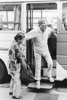 | デイケアから帰宅する夫を妻が支えて。障害をもつ木谷光子さんに介護されて、夫の義男さんも「気の毒やのう」と |