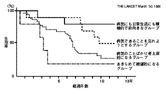 乳がん患者さんを4つのグループにわけ、病気の経過をみてみました。 第1は「病気には負けない」と積極的に前向きに立ち向かい、日常生活にも積極的な グループ、第2は病気であることを忘れようとする否認の立場にたつグループ、第3は病気のことを深刻に考え、いつも病気のことばかり考えているグループ、 第4はもうダメだとあきらめて絶望的になっているグループです。