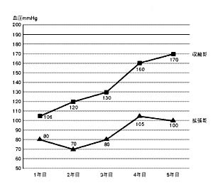 図2は、もともと血圧が低かったのに、4年目に高血圧になり、5年目に眼底出血して退職した労働者の健診時の血圧の推移です。職場全体でも平均値で明らかに血圧値の上昇がみられました。