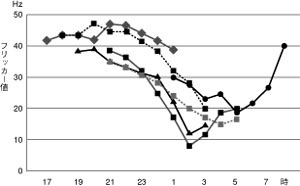 図3は、労働時間に沿って、点滅する光をどれだけ認識できるか調べた(フリッカー検査)結果です。 多数の労働者の傾向をまとめた図ですが、全員、深夜帯に著明な疲労状態を示しました。