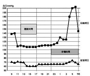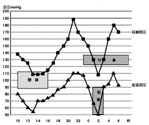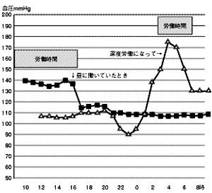 深夜働きますと、その時間帯は150mmHgから170mmHgくらいに上がっています。通常健診が実施される時間は日中ですから、すでに始まっている血圧上昇を見逃し続けていることになります。