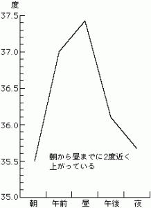 図1にあるように、朝おきたときの体温が35度台の子は16.8%いました。しかし、この子たちも 学校にきて遊んだりしているうちに、昼ごろにはほぼ全員が36度台の平常値に入ってきます。つまり「低体温の子が多い」という先生たちの実感は、朝、家で 計ってきた数値を聞いて感じていたものだったわけですね。