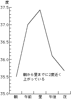 一方、高体温の子は、からだにこもった熱を発散する力が育っていない子です。こういう子は、午後になってはげしく運動したりすると、熱を発散できずに体 温がグングンあがっていってしまいます。