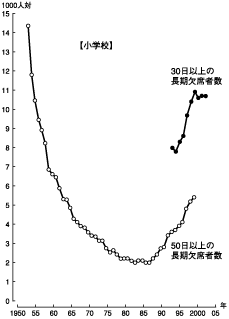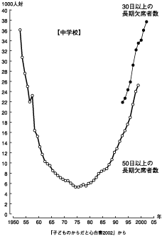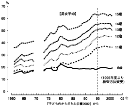 | 図3 テレビ、TVゲームなどの出荷金額の変化 | 図4 学校を長期欠席した児童・生徒の割合の変化 文部科学省『学校基本調査』から、ただし2001年度値は「学校基本調査月報」から |