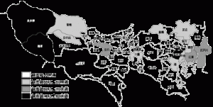 子どもたちの健康診断の結果は東京都も毎年、統計を発表していますが、ある年から「むし歯の子」について地域差を地図にして発表しました。23区の子は比較的少なく、市、郡、島しょとなるにつれて多くなる傾向が明らかになっていました。