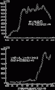 からテレビゲームの出荷高が急増することがわかります。この結果は、視力不良の子が74年あたりからふえはじめ、86年あたりからさらに急増する図1の転換点と、かなり一致しています。