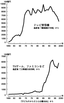 図3は、テレビ受信機とファミコンなどテレビゲームの出荷高の、年次推移を示したグラフです。70年代に入りテレビの出荷高が頭打ちになり、85年ごろ