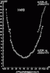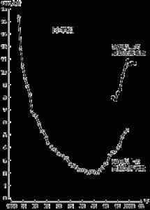 すると、図1で明らかなように、74年からこの割合がふえはじめ、現在にいたるまで法則的に年々増加し続けているという傾向がはっきりしてきたのです。 95年から増加が止まったようにみえますが、これはこの年から検査方法が変わったためです。もし以前と同じ方法で検査されていたら、ふえ続けていると予想 されます。(検査方法の変更については、後でふれます)