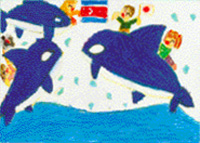 まるで海から飛び跳ねているような三頭のシャチの絵を描いたのは、日本の小学四年生。絵の中の三人の子どもが三国の国旗を手に持っているところが印象的だ。この絵には、「早く三つの地域が仲よく平和になればいいな」というメッセージがつけられている。