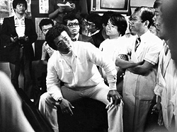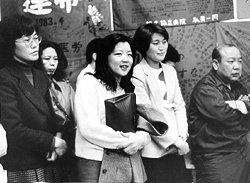 | 和議が可決された債権者集会(84年3月27日)の報告を聞く職員。全国からの檄旗の前で |