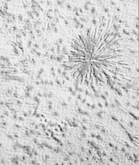 | 酸化プルトニウム微粒子によるマウスの内部被ばくの電子顕微鏡写真 (「ECRR勧告」表紙から)。肺組織に吸い込まれた微粒子中のプルトニウム原子核が一つ崩壊するたびにアルファ粒子が一つ走り、そのエネルギーで遺伝子 などが数十万カ所切断されて軌跡ができる。崩壊がくり返されて星型の軌跡になる。瞬間的な外部被ばくと異なった、持続的な内部被ばくの怖さが見てとれる |