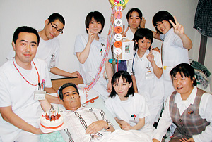| 盛大に還暦のお祝いをしたNさんと病棟スタッフ。左端和田医師 |