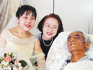 病棟に連絡すると、ナースたちはすごいスピードで準備をはじめました。当初花嫁は、あまりにも唐突な申し出に大変混乱しました。いま花嫁姿を見せること が本当にいいのか、いきなり決断を迫られても、決めかねるのも当然でした。しかし、とにかく時間がありませんでした。S医師は、花嫁と話しあいました。