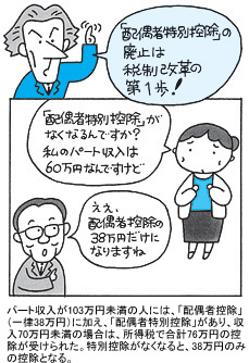 収入から必要経費やさまざまな所得控除を引いた額が「課税所得」。それに税率をかけた額が「所得税額」です。ですから控除を縮小・廃止すれば所得税額は 大きくなります。04年から「配偶者特別控除」が原則廃止されたことを、税調は「税制改革の第一歩」と高く評価しています。