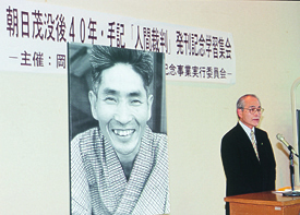 | 『人間裁判』復刊の集いで朝日さんの遺影を背にあいさつする養子の健二さん(2月14日、岡山) |