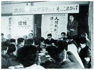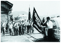 | 1961年、全国から早島にかけつけた第一次現地調査団 | 1963年、バスを乗り継いで旗をリレーした「朝日訴訟を勝ち抜くバス行進」。姫路で岡山から兵庫にバトンタッチ |