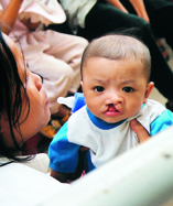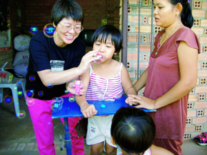 脳性マヒの子。お母さん(右)がとても大事にしている。シャボン玉遊びでリラックスさせる大城さん |