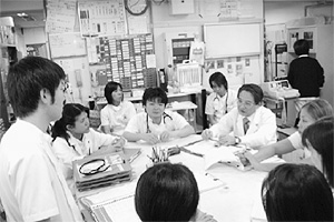 研修医と看護師はカンファレンス(症例検討)をくり返して学びあい、情報を共有し、患者さん本人にとって何がよいかを議論して治療方針を決めています。