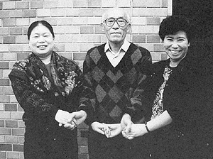 | 助成金の朗報に喜ぶ木暮さん(中央)、向かって左は富沢さん、右は鐘ケ江さん(1991年) |