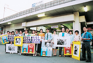 戦争放棄の憲法九条に、京都・九条通りをかけて、毎月九日に宣伝行動。吉祥院病院エリアの職員のとりくみです。「平和憲法YES、自衛隊イラク派兵 NO」のかわいいパンフを配っているのは外来看護師の宇野智子さん、リハビリ室の橘美岐子さん。「職場の仲間と交代で参加しています。ここへくると気が晴 れ晴れします」とさわやかな笑顔です。