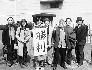 | 勝利判決を喜ぶ支援の人たち。右から3人目が筆者の島田務さん(3月16日、最高裁前) |