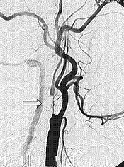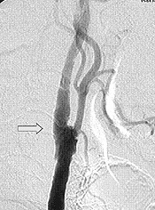 | →部分の血管のつまり(術前)をとり、血液が太く流れているのがわかる(術後)=脳血管造影 | |