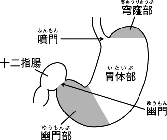 噴門は、胃袋の内容物が食道に逆流しないように筋肉が弁のはたらきをします。幽門は、時間をかけて胃袋の内容物を少しずつ十二指腸に送り込む蛇口の役割をもっています。