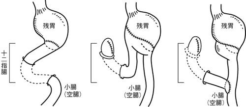 胃袋を切除し、小腸とつなぐ方法を「再建術式」といいますが、これにもいろいろな方法があります(図2)。